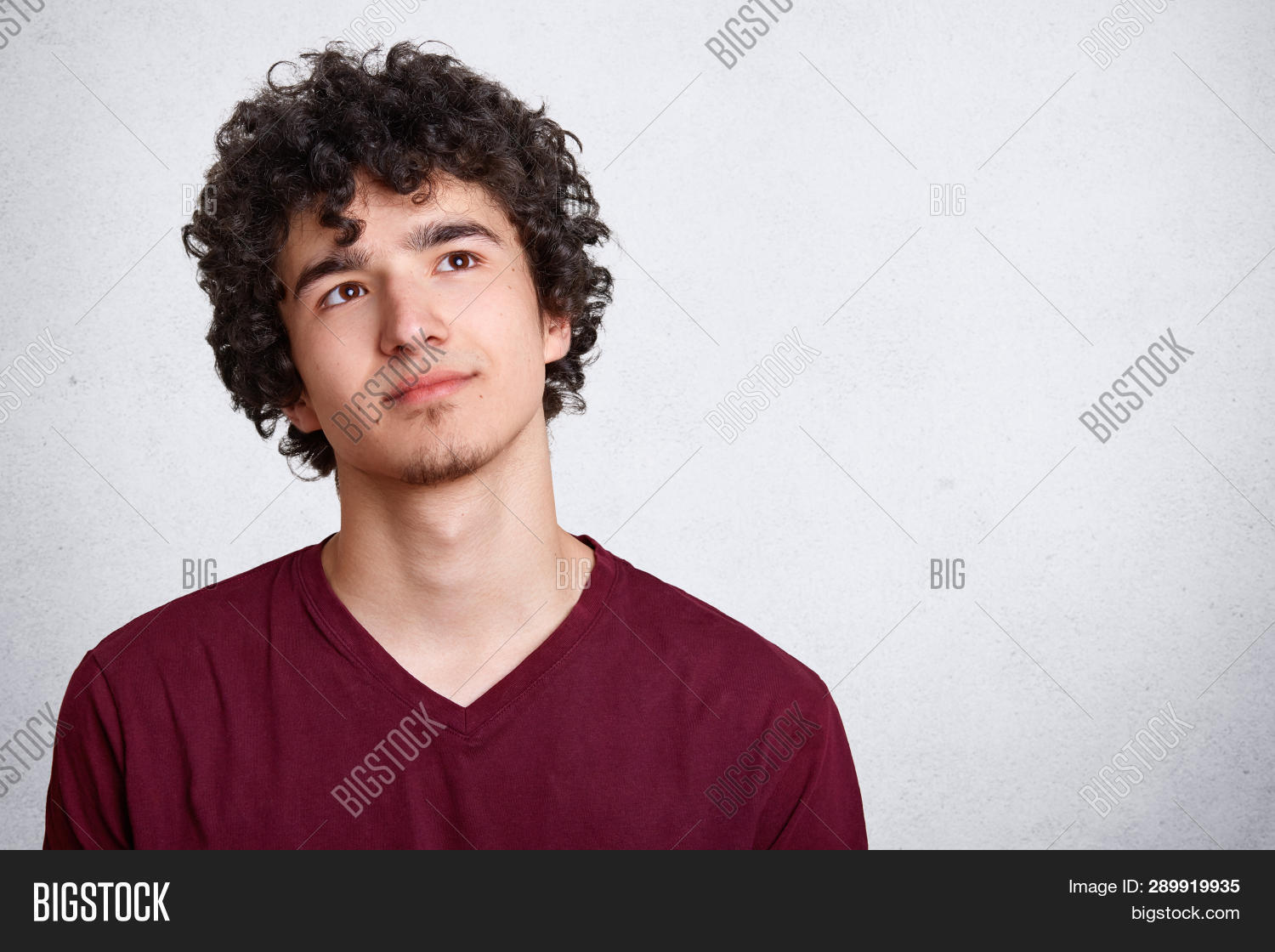 Close Up Portrait Of Young Man With Curly Hair In Maroon T Shirt