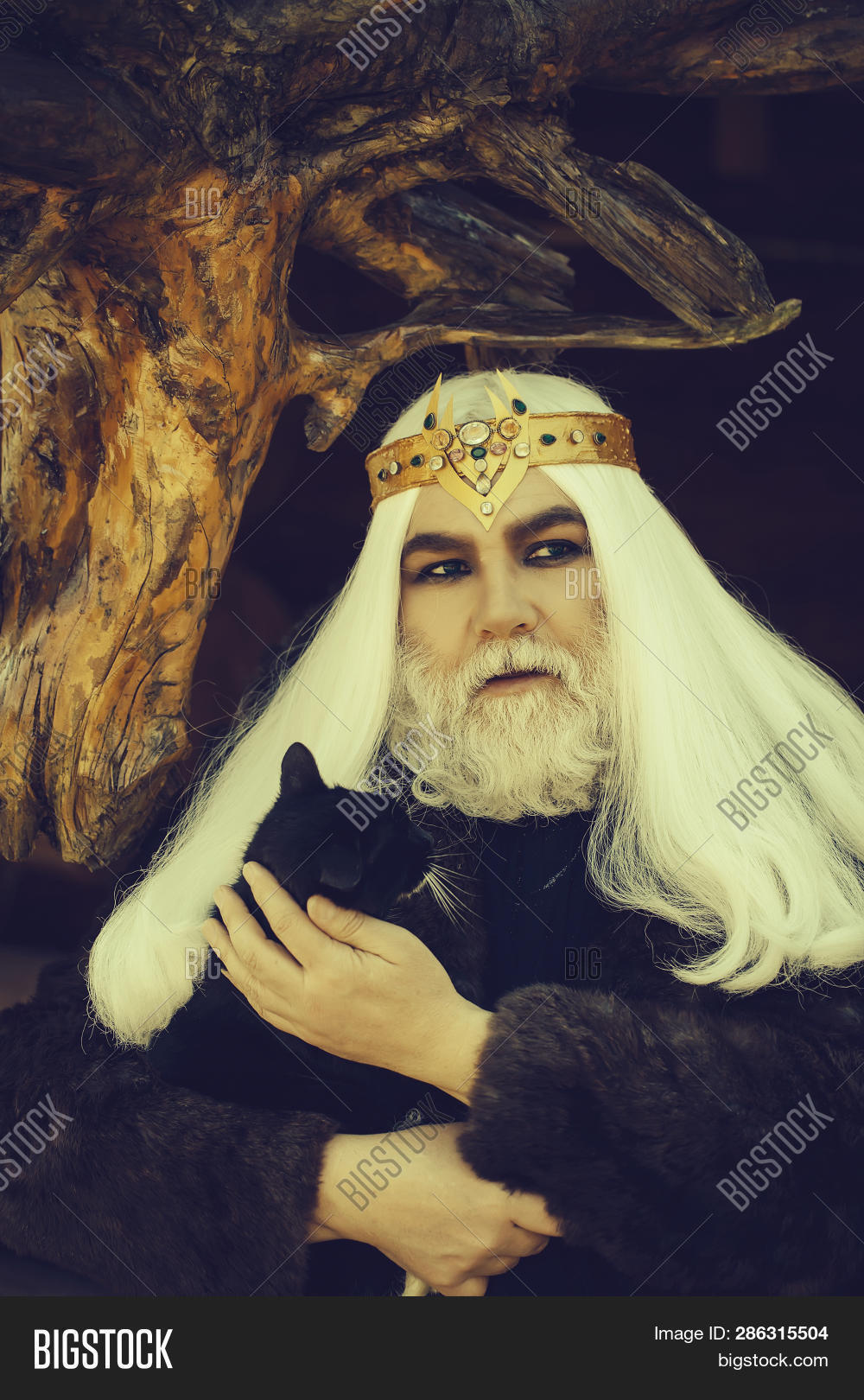 Druid Old Man With Long Silver Hair And Beard In Fur Coat With